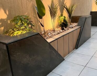 استخدام صف من الأحواض الكبيرة لتقسيم الجلسة الخارجية إلى مناطق مختلفة (مثل منطقة الطعام ومنطقة الاسترخاء